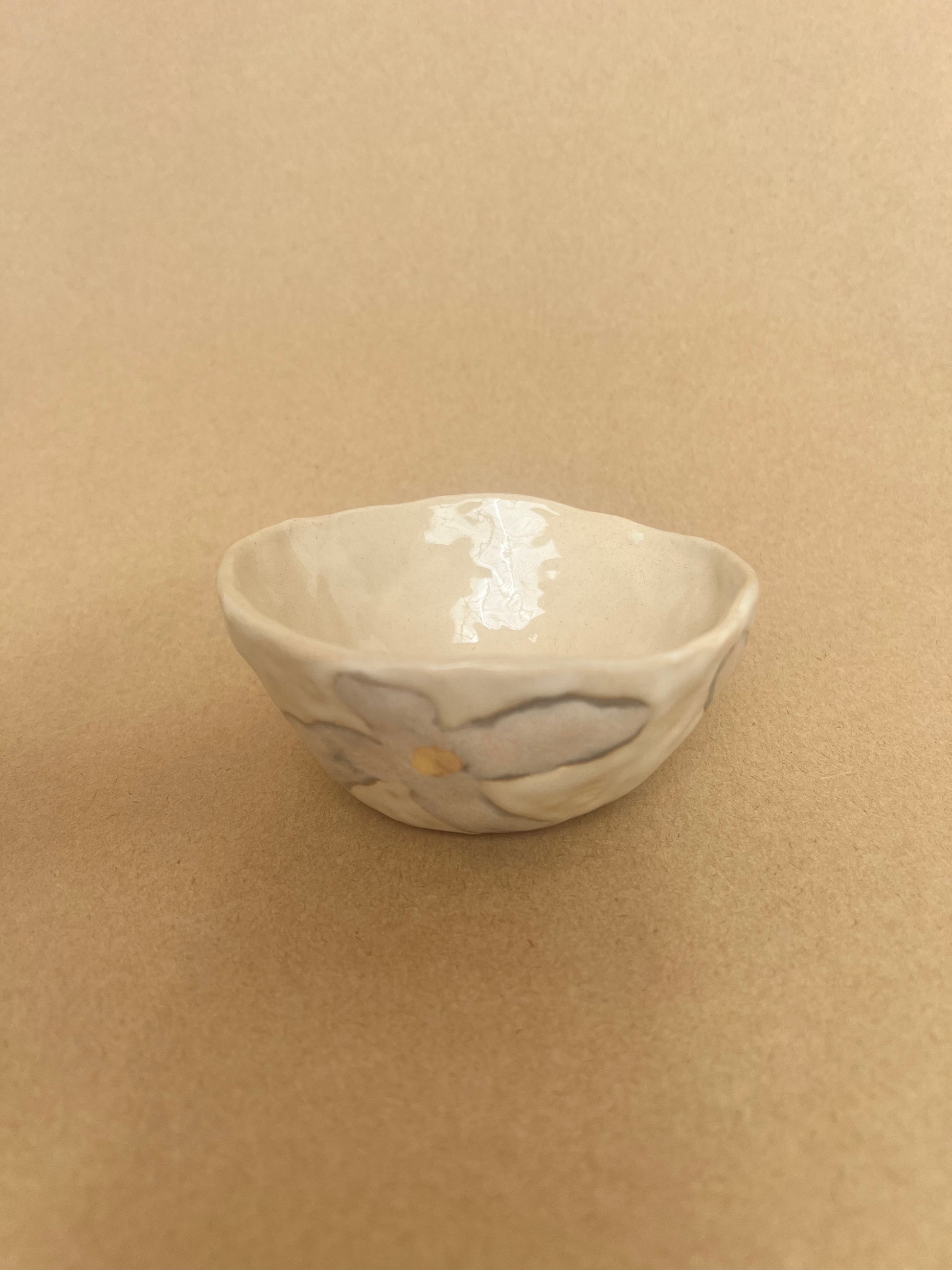 Anne-Sophie Matrella's signature large floral design on these beautiful small bowls. Perfect on your shelf, to serve a delicious dip or small snack or by your bedside for your special rings and things.