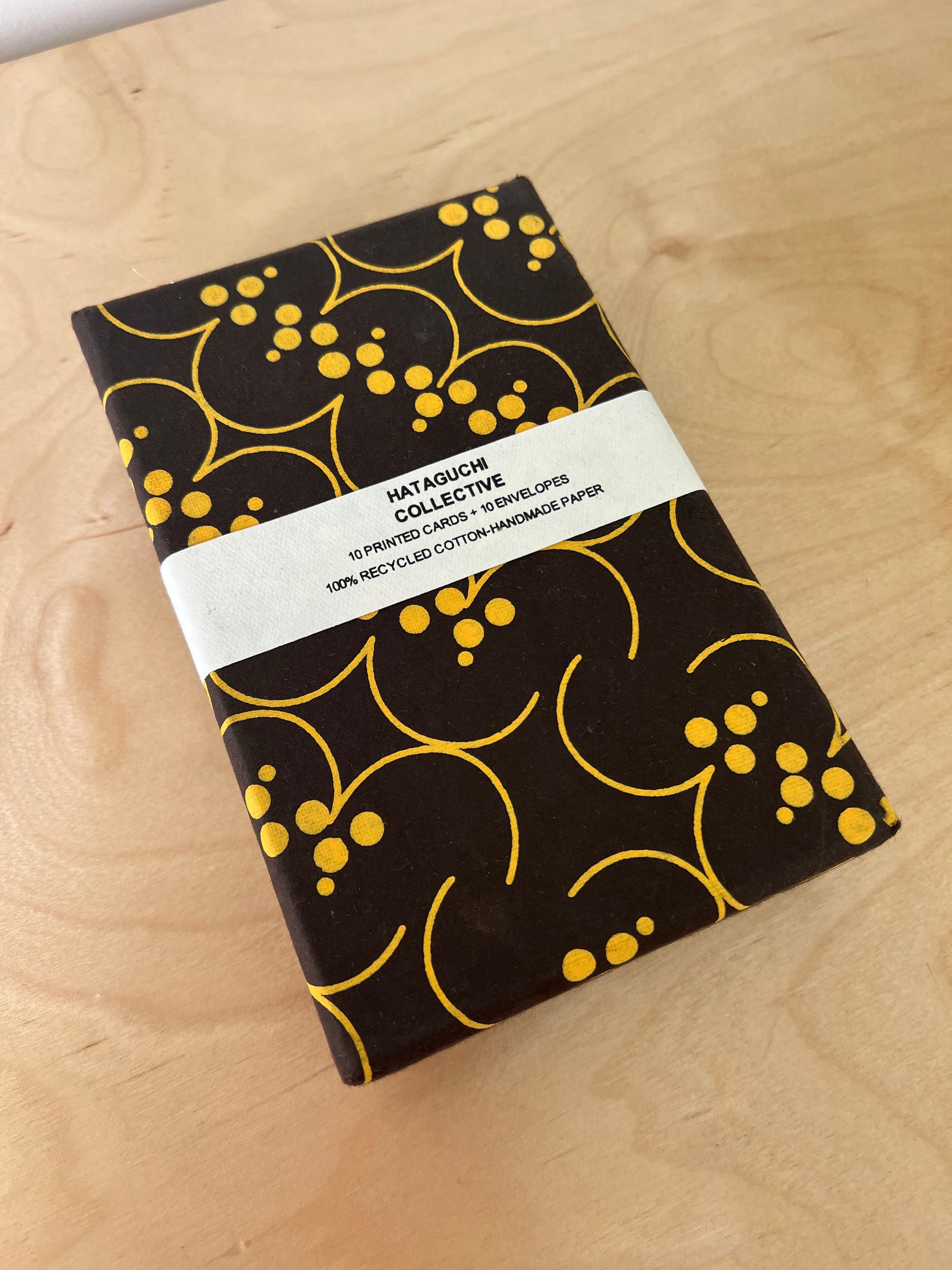 10 x cards and 10 x envelopes, screen-printed on recycled cotton rag paper in India.